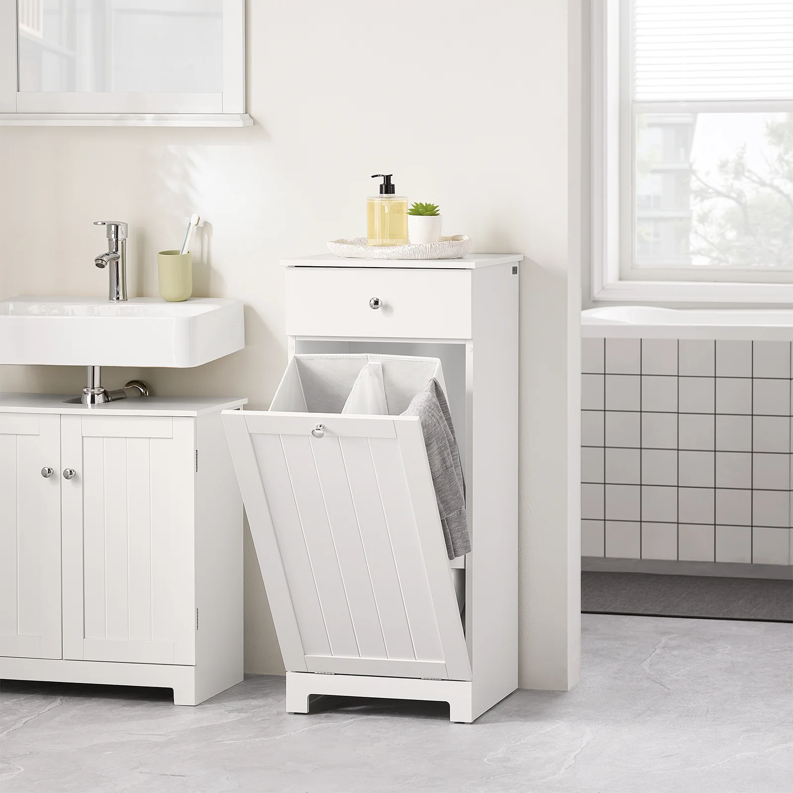 It features a cupboard with drawer and concealed laundry basket making it a practical addition to any bathroom.