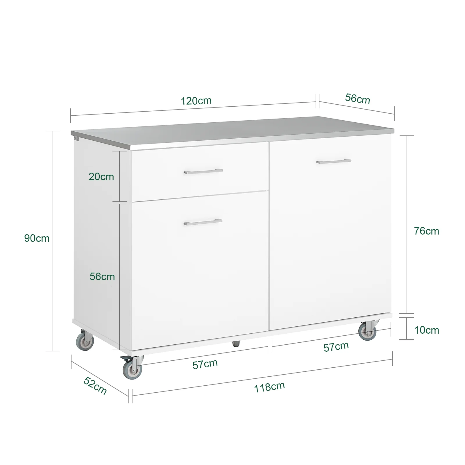 SoBuy FKW117-W, Kitchen Island on Wheels Rolling Kitchen Storage Trolley with Stainless Steel Worktop for Dining Room, Breakfast Bar, and Kitchen White W120 x D56 x H90 cm