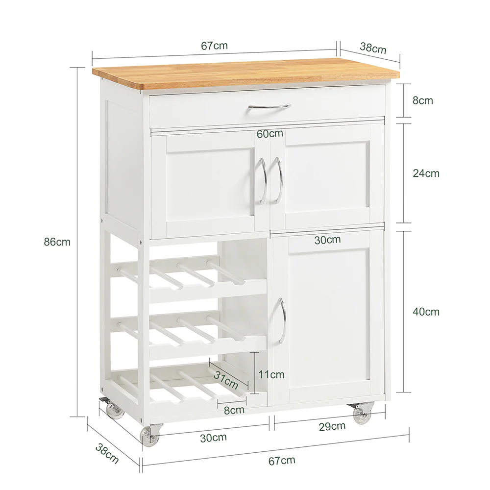 [SMART MOBILE KITCHEN STORAGE]: This kitchen trolley on wheels is perfect for small spaces, offering a mobile kitchen island with a rubberwood top, cupboard, drawer, and wine rack – perfect for keeping your essentials stylishly organised in a compact kitchen setting