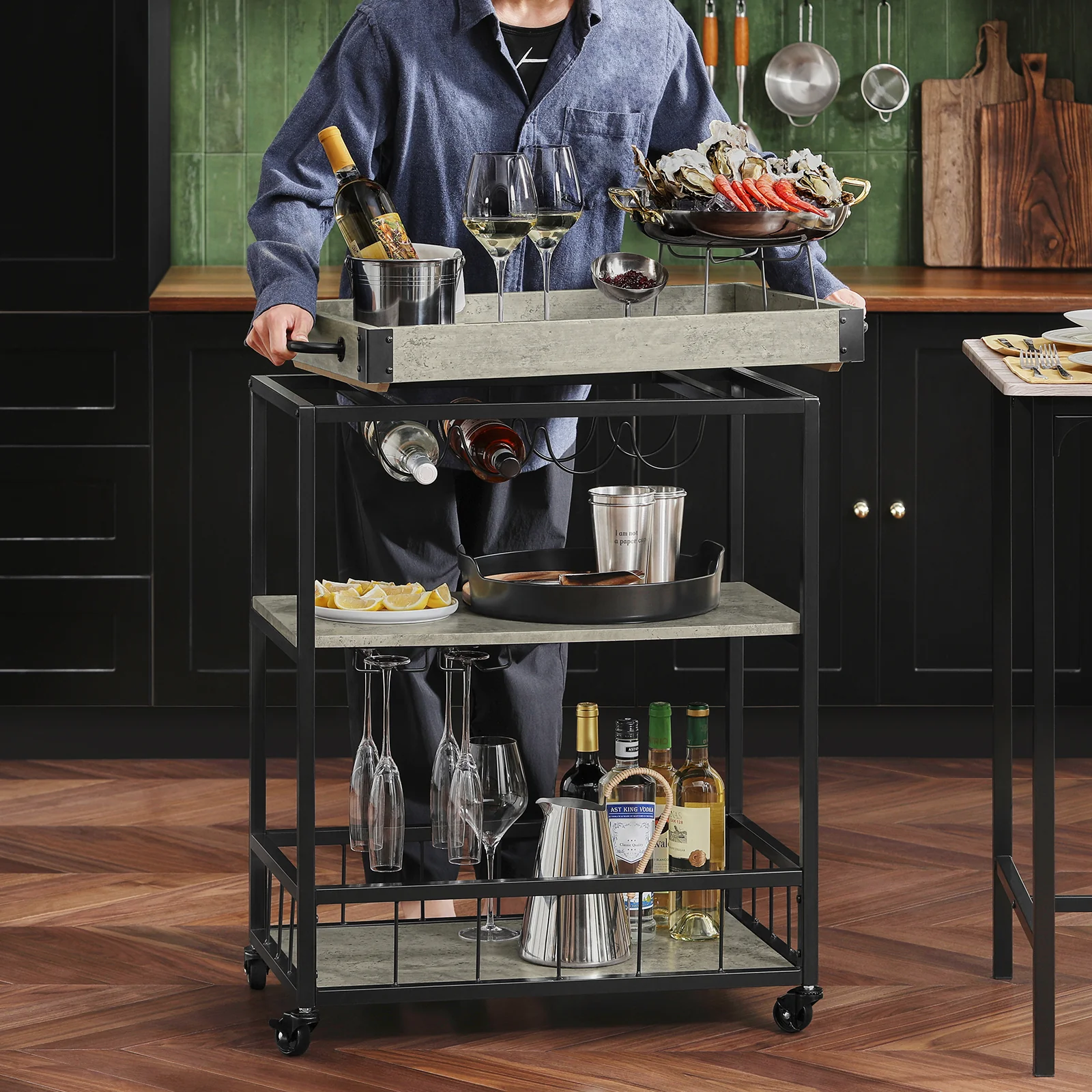SoBuy FKW56-HG, Modern Design 3 Tiers Kitchen Trolley Serving Trolley with Wine Rack Metal & MDF, Grey