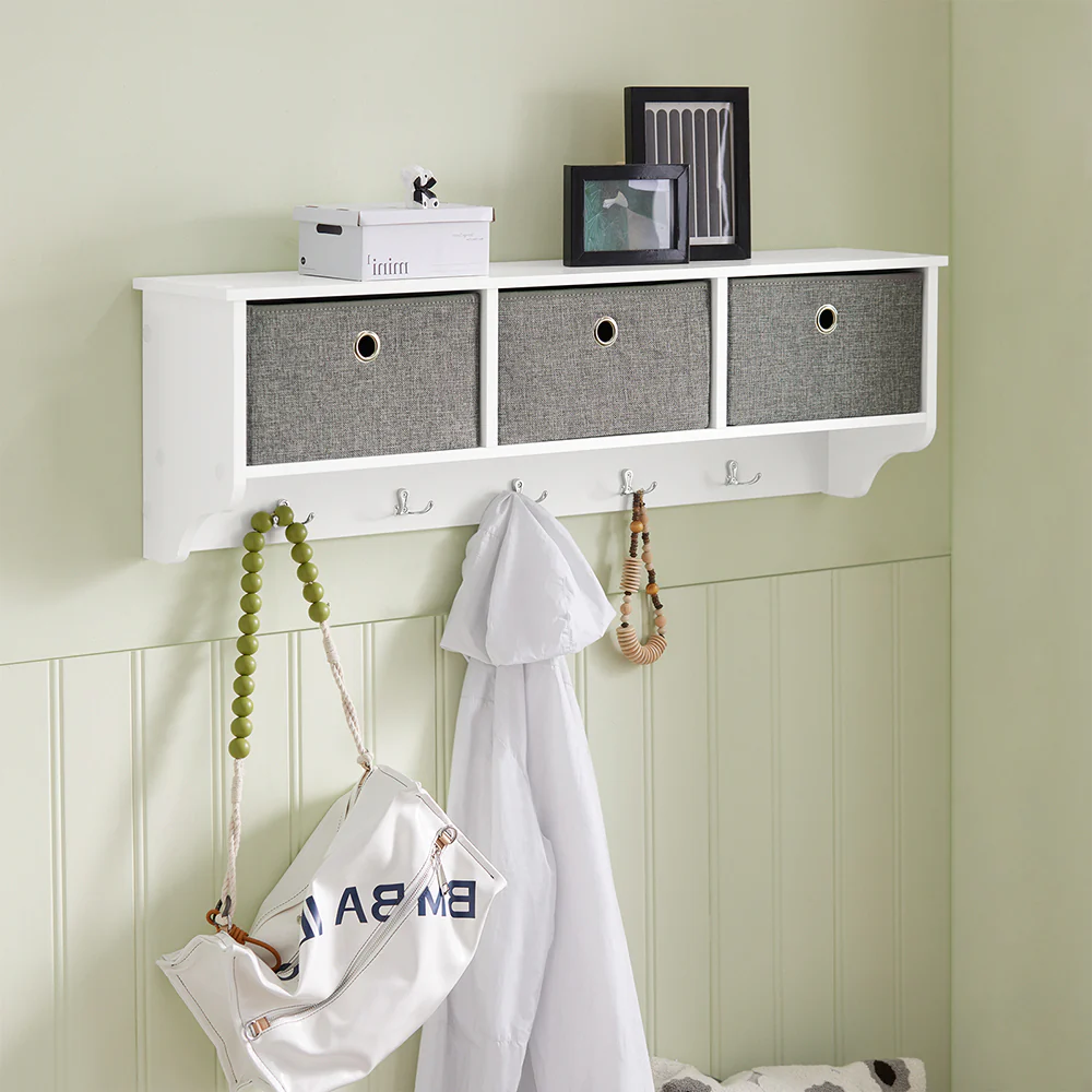 The baskets made of fabric are removable and foldable. They offer enough storage space for the keys, letters and the other small items.