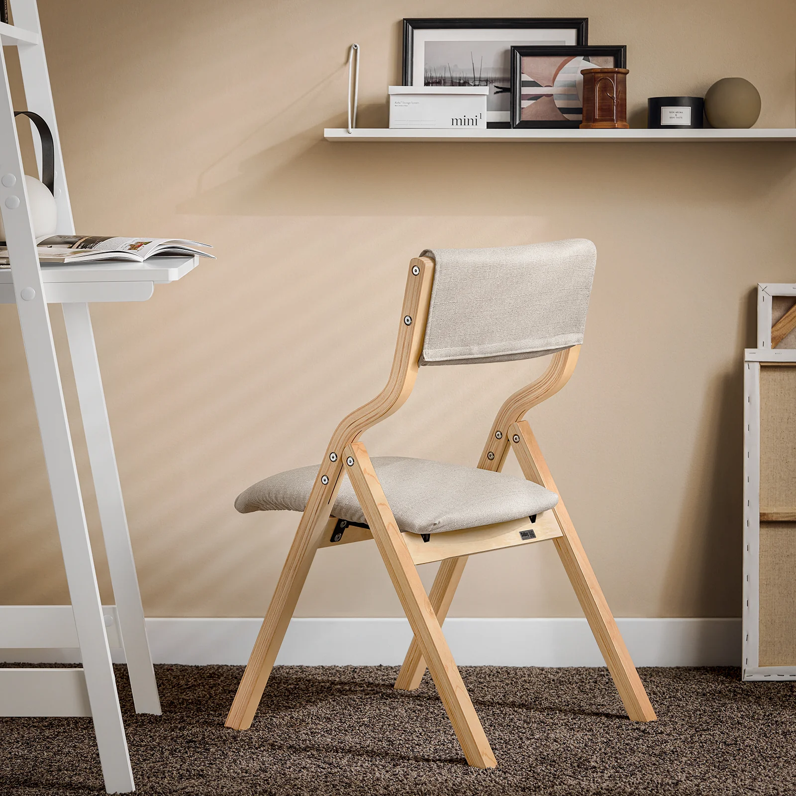 The SoBuy FST40-HG is a grey wooden folding chair combining solid rubber wood construction with a padded seat and backrest for everyday comfort. Measuring W48 × D54 × H80cm with a 40cm seat height, it folds flat in seconds for easy storage — no assembly required. The removable, washable fabric covers make maintenance effortless, and with a 90kg load capacity it’s built for daily use in kitchens, dining rooms, offices and small spaces.