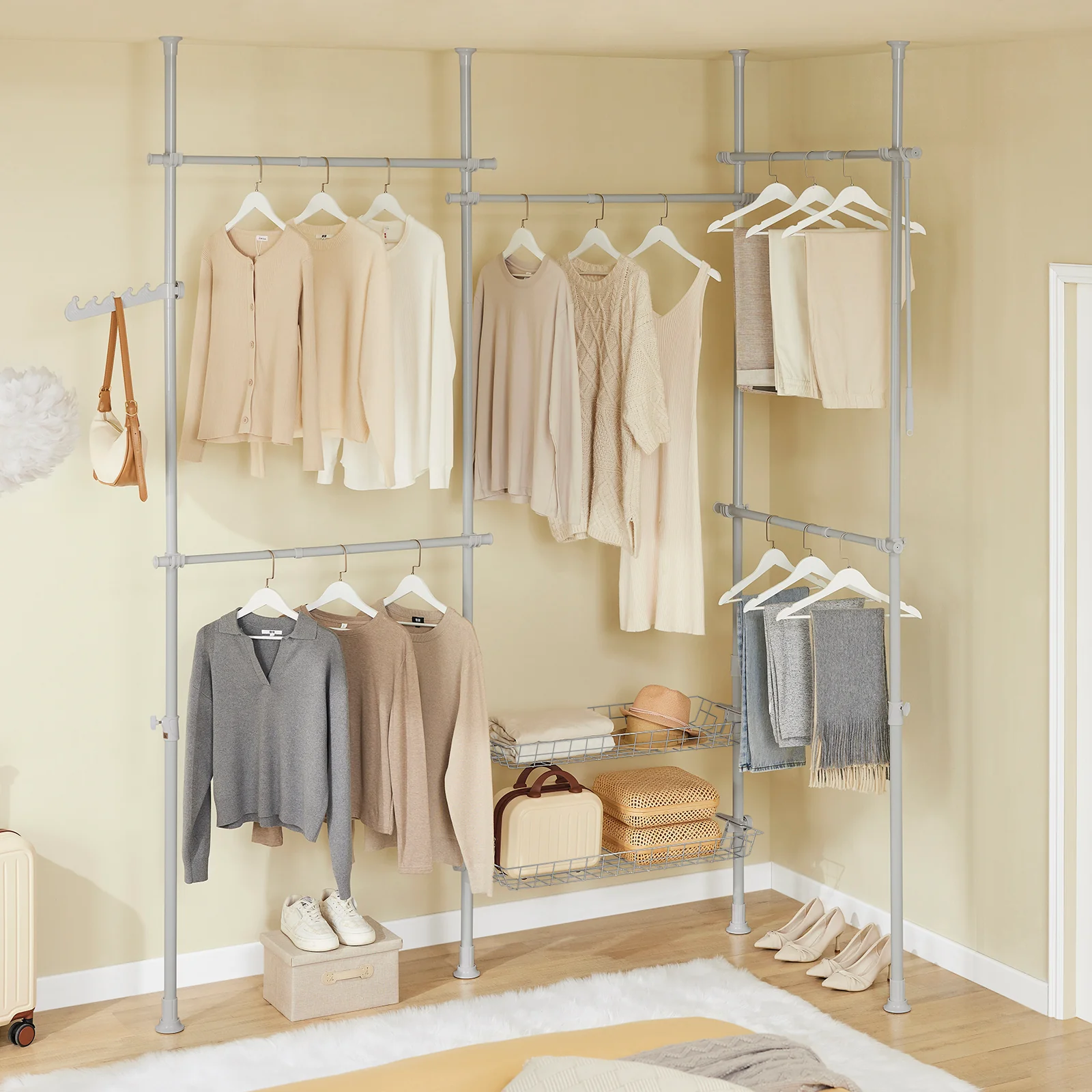 [VERSATILE TELESCOPIC CLOTHES RAIL SYSTEM] Featuring 4 adjustable poles, 5 hanging rails and 2 baskets, allowing you to create a customizable open wardrobe. Perfect as a heavy duty clothes rail for bedrooms or walk-in closets without permanent installation